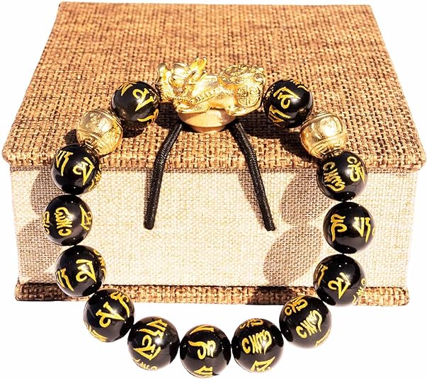 • Durable Crystal Rope: Feng shui pixiu wealth bracelet suitable for wrist circumference 5.9~8.2 inches (15~21 cm), suitable for most men and women. Six-syllable mantra beads (Diameter: 0.47 inches (12 mm), Material: gilded obsidian); PiXiu (Size: 1.05*0.47 inches (26.5*12 mm), Material: 24K gold-plated pixiu); Gold beads (Diameter: 0.47 inches (12 mm), Material: 24K gold-plated bead). The buddhist prayer beads is connected by a durable crystal elastic rope to ensure the bracelet is durable.
